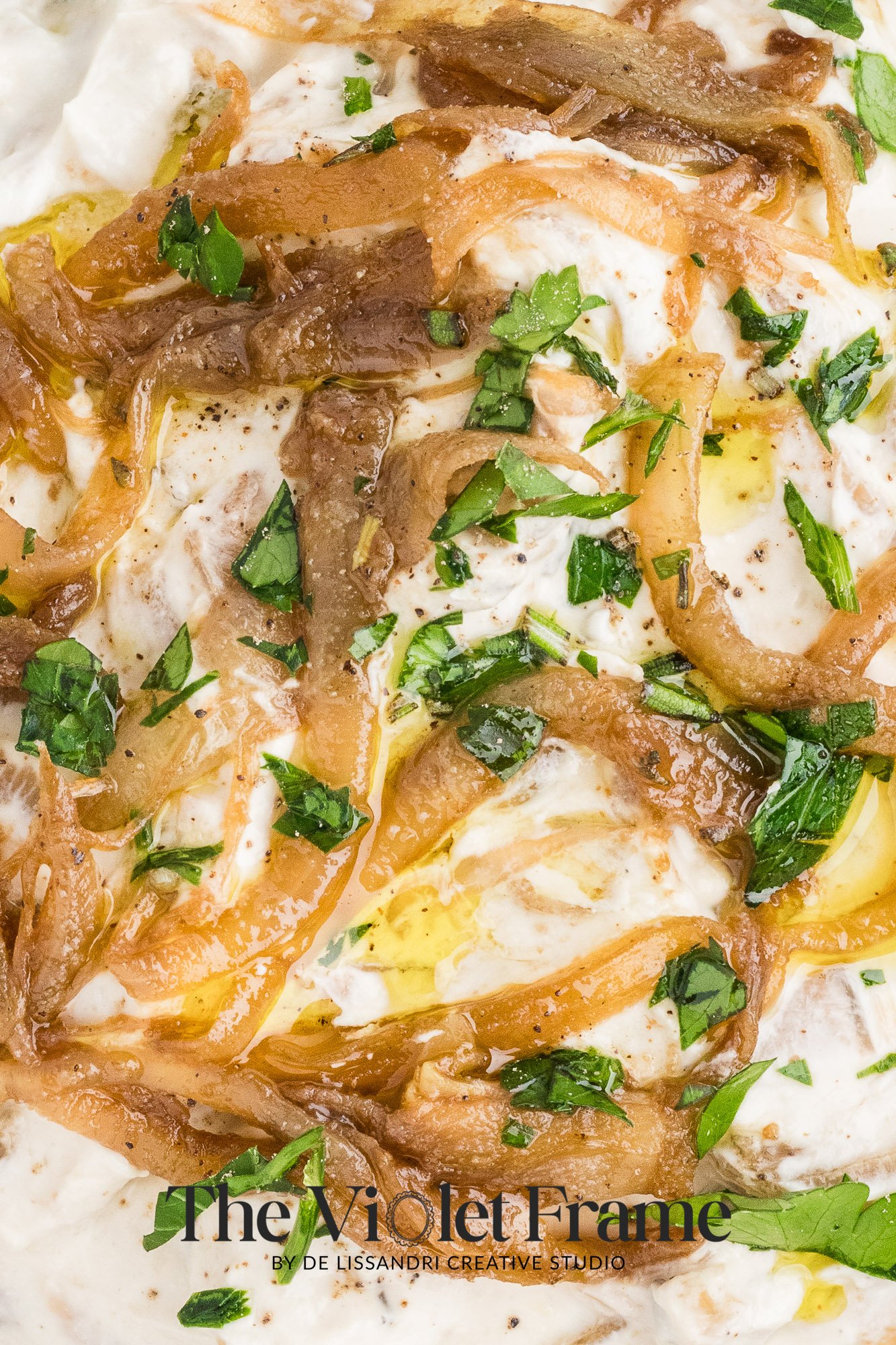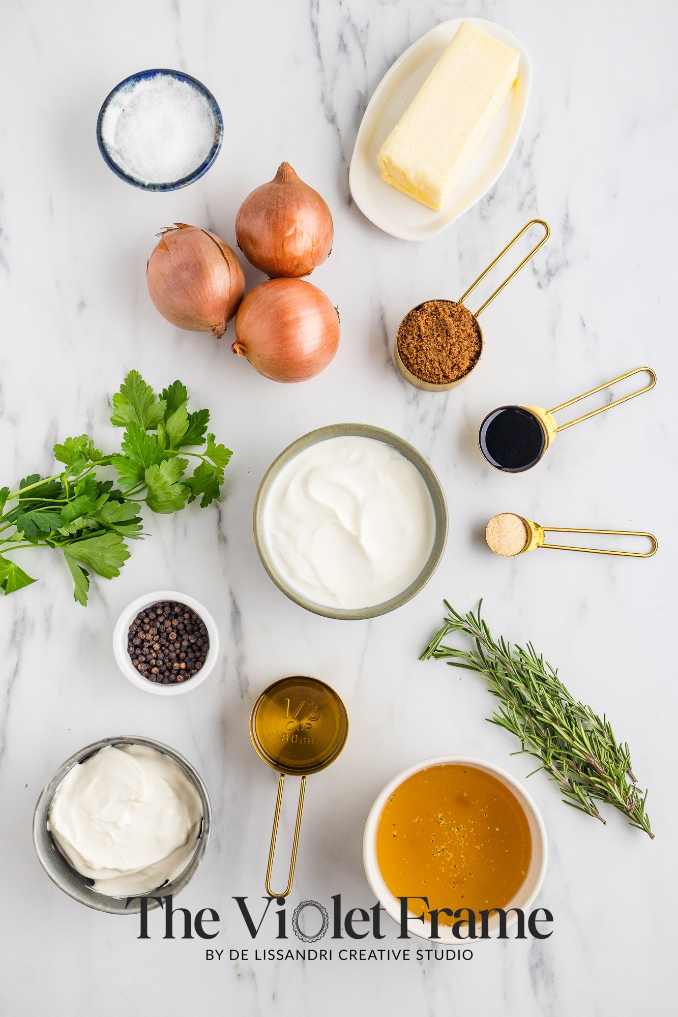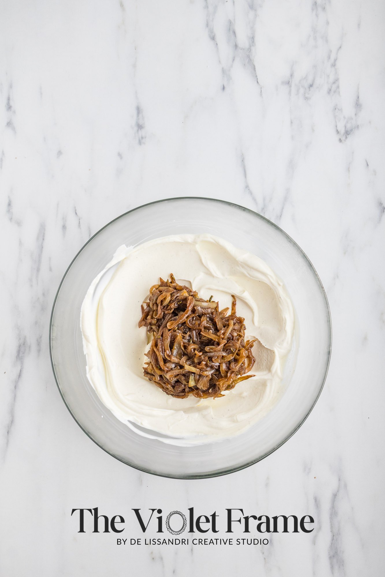 Featured Ingredients: butter, yellow onions, brown sugar, balsamic vinegar, garlic powder, rosemary, Greek yogurt, cream cheese, black pepper, parsley, extra virgin olive oil.