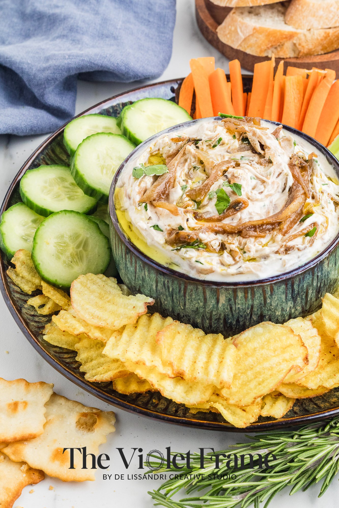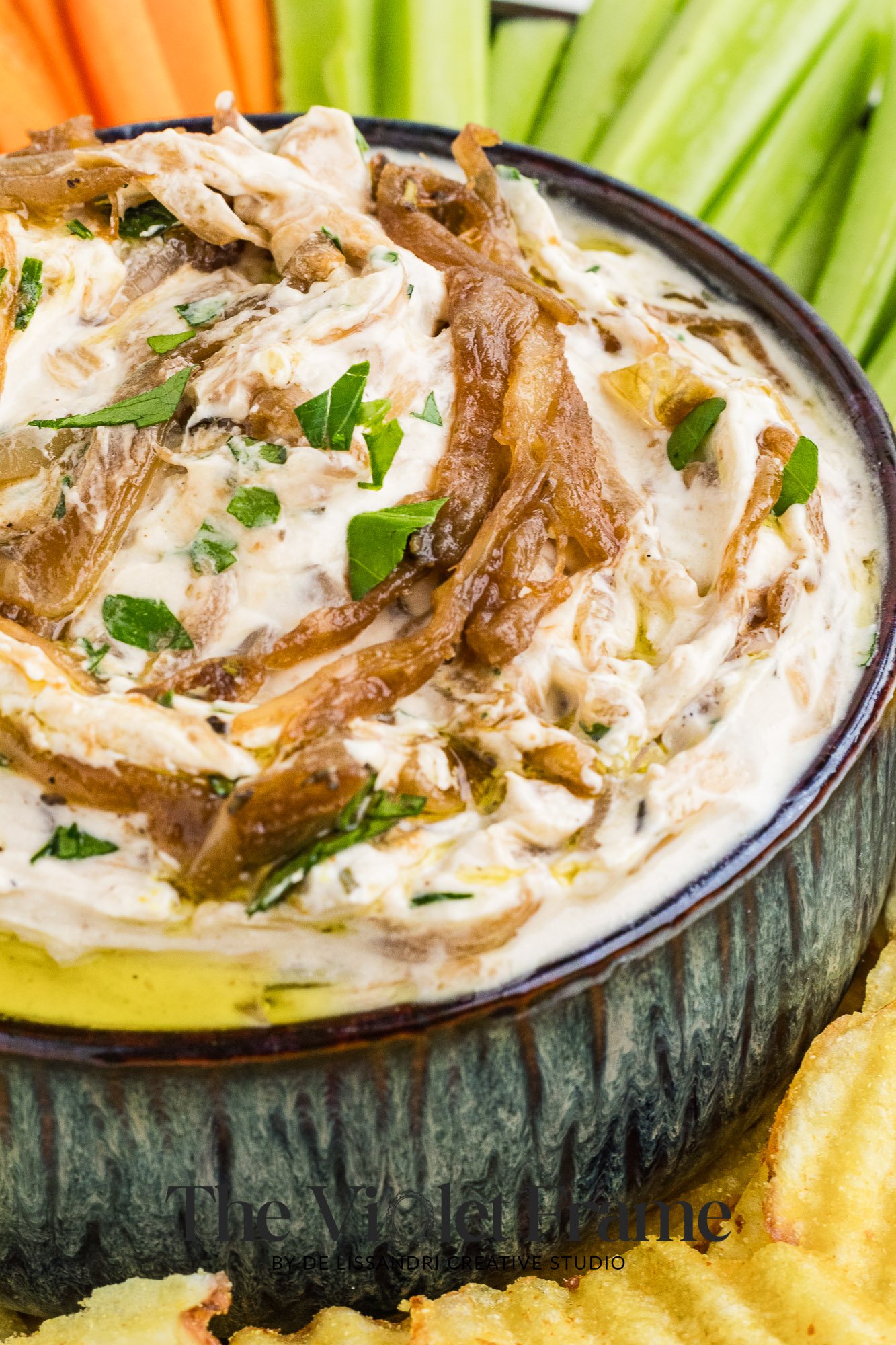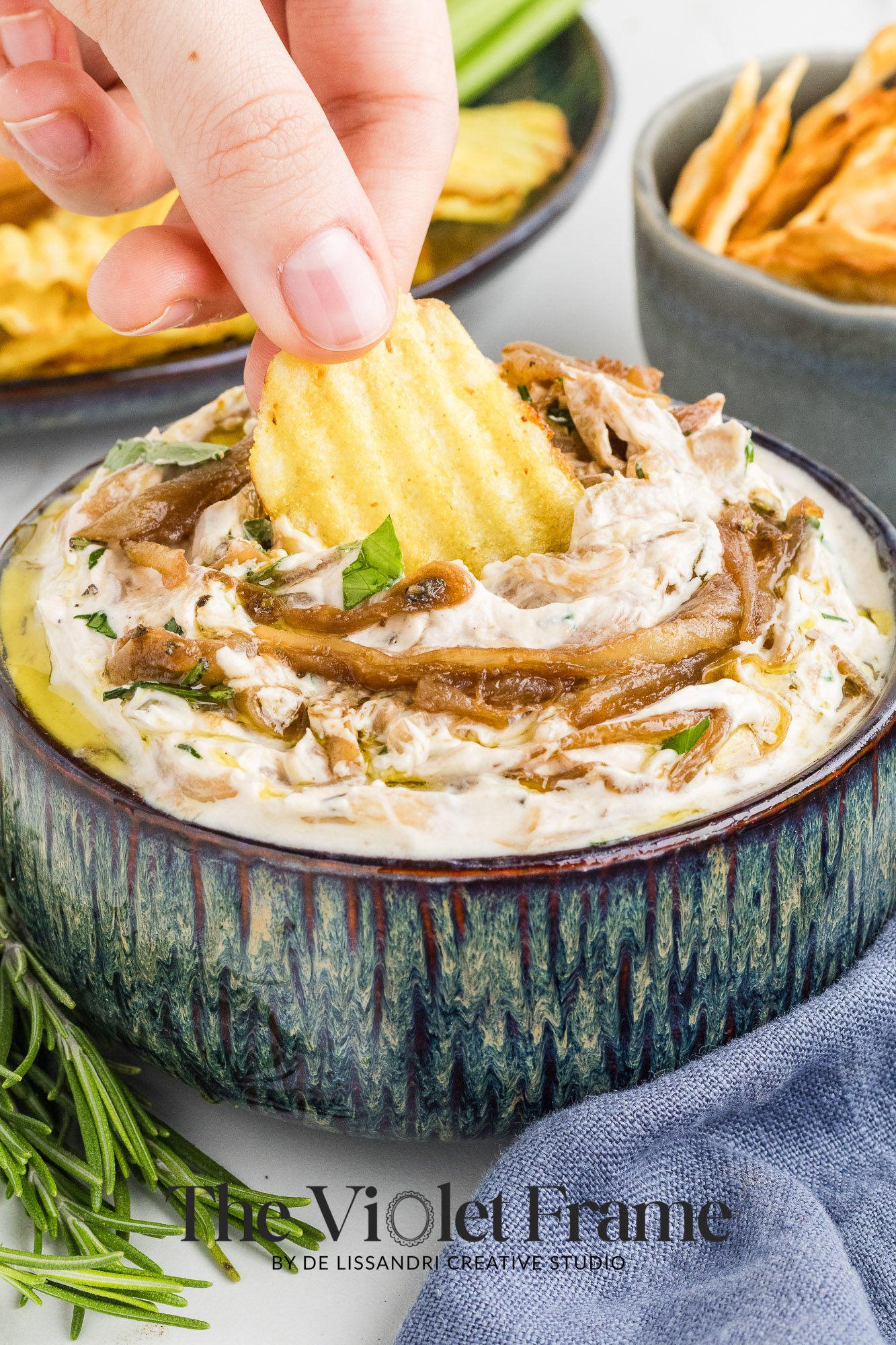 This Caramelized Onion Dip is the perfect party appetizer—creamy, rich, and full of melt-in-your-mouth sweet onions. The base is a light, tangy mix of Greek yogurt and cream cheese. The caramelized onions are glazed with balsamic vinegar, brown sugar, and broth for all the caramelized goodness. The caramelized onions are a bit of a work of patience, but the dip can easily be made a couple of days in advance, especially for hosting (it actually tastes even better on day 2).