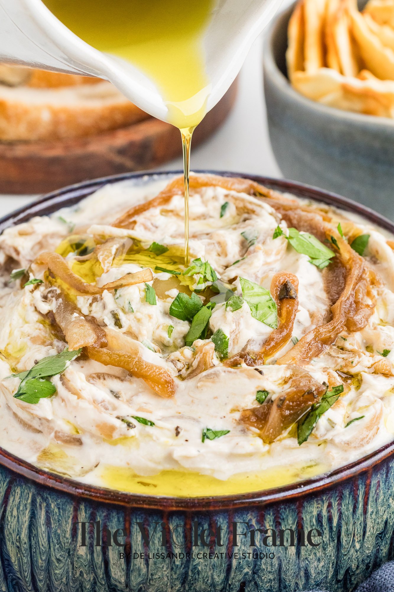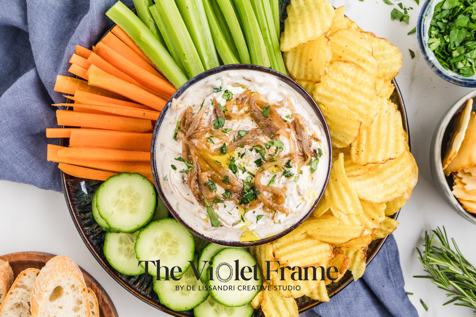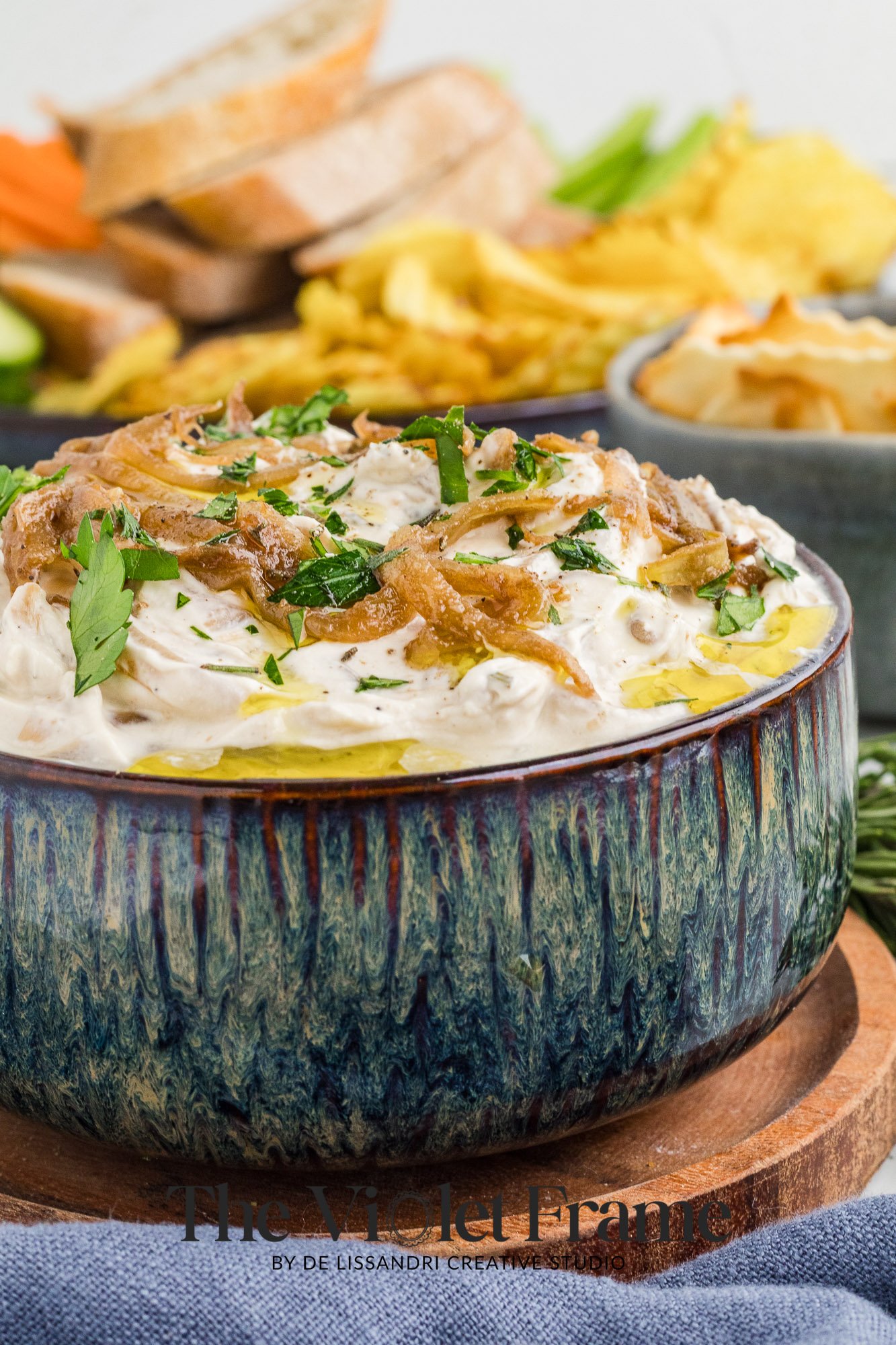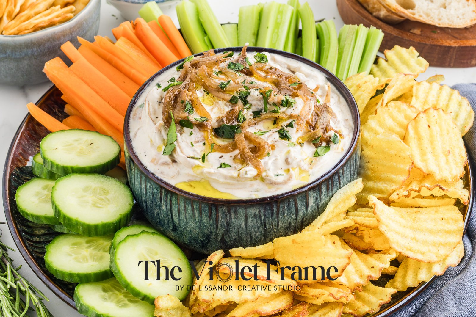 This Caramelized Onion Dip is the perfect party appetizer—creamy, rich, and full of melt-in-your-mouth sweet onions. The base is a light, tangy mix of Greek yogurt and cream cheese. The caramelized onions are glazed with balsamic vinegar, brown sugar, and broth for all the caramelized goodness. The caramelized onions are a bit of a work of patience, but the dip can easily be made a couple of days in advance, especially for hosting (it actually tastes even better on day 2).