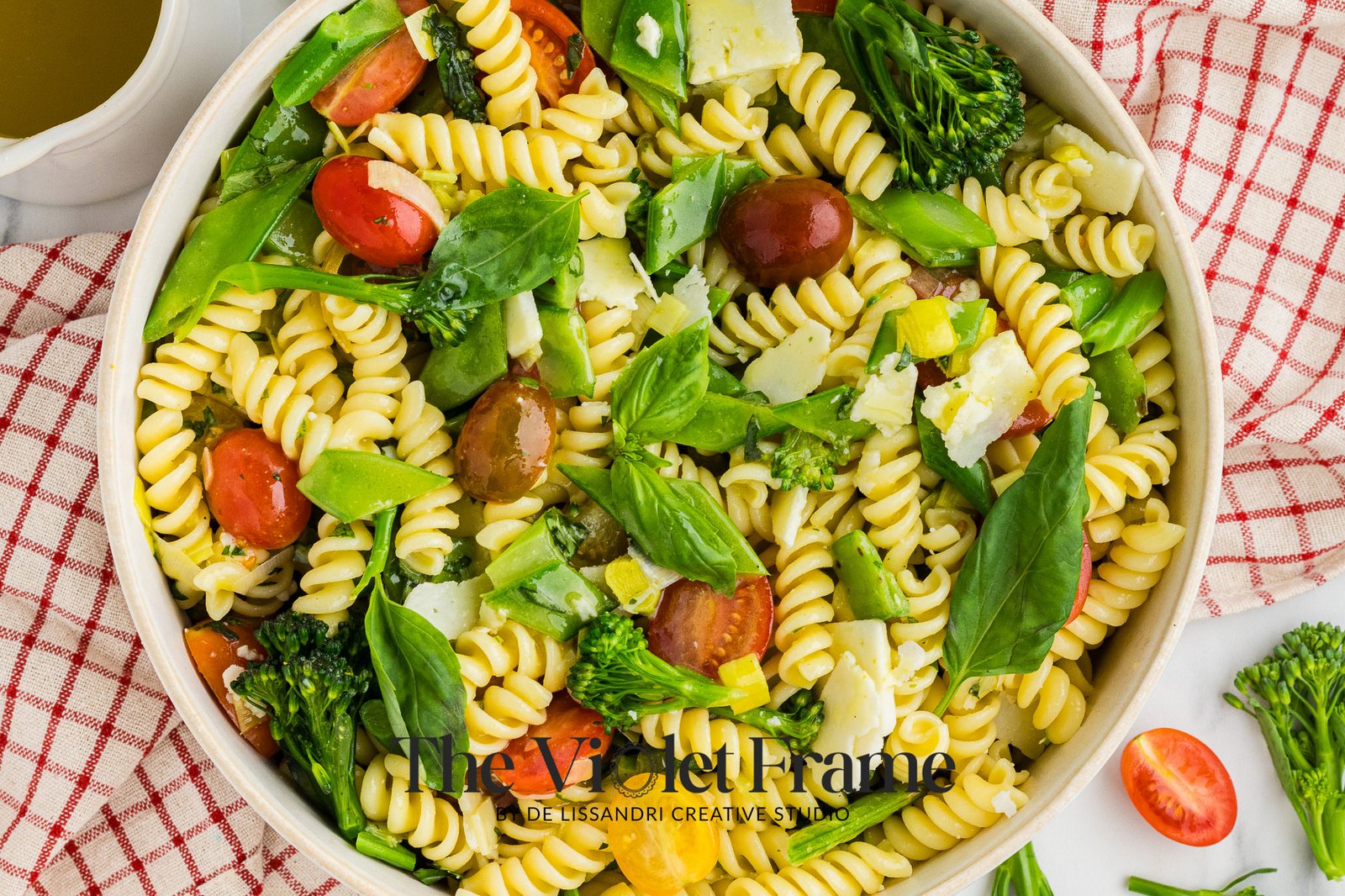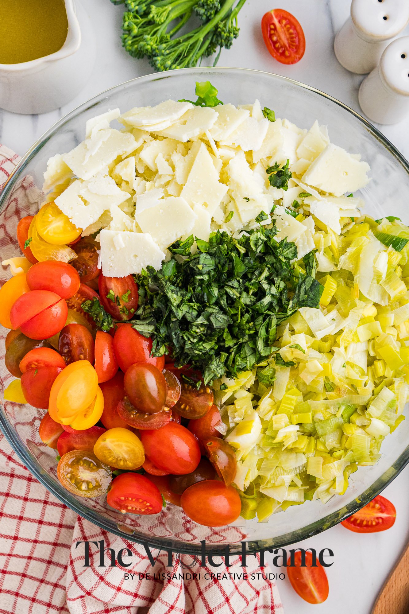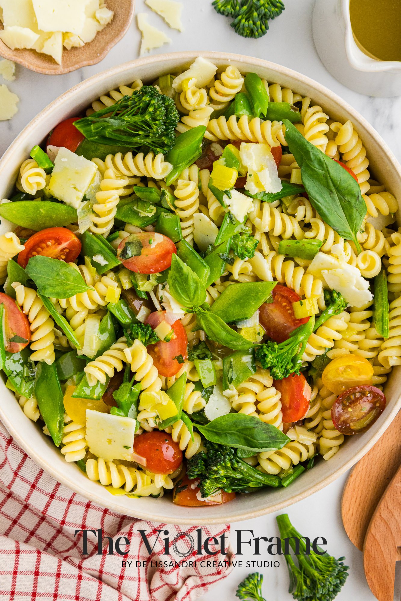 Featured Ingredients: pasta, broccolini, snap peas, leeks, cherry tomatoes, Pecorino, fresh basil, and vinaigrette.