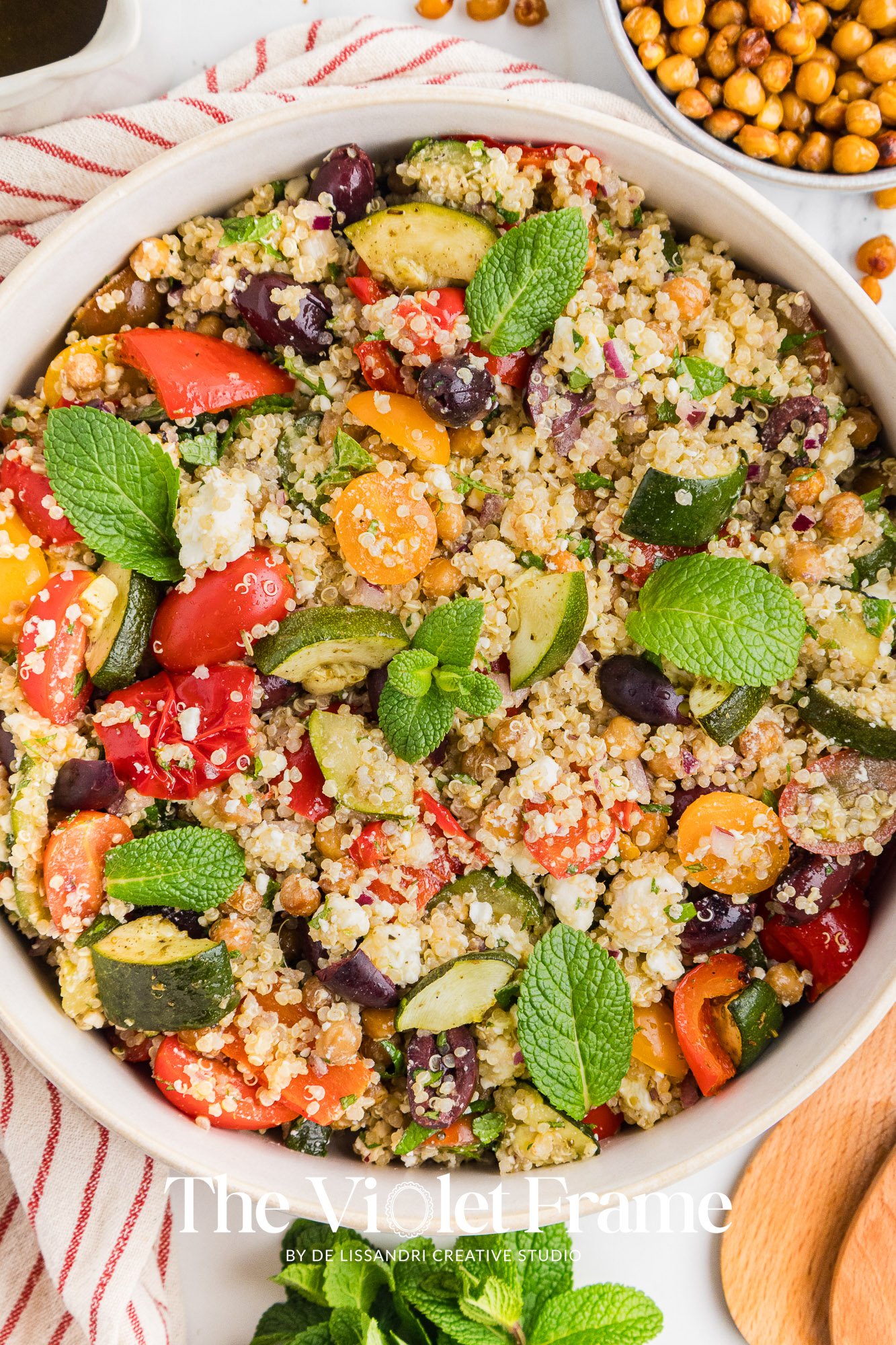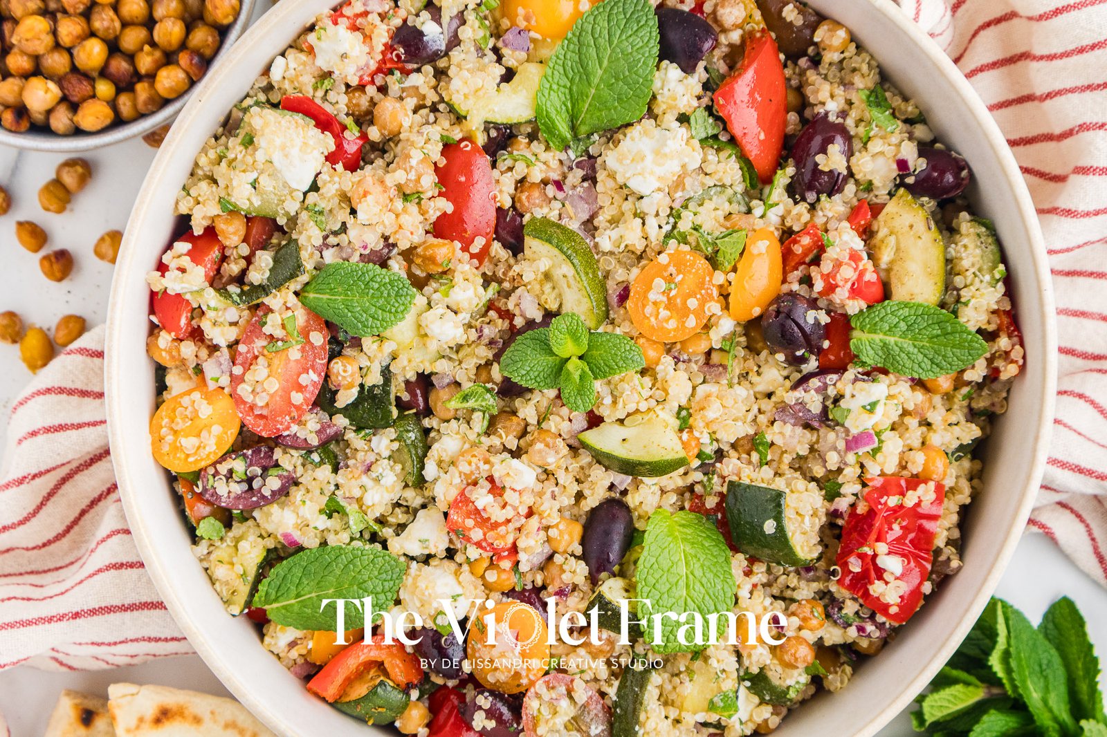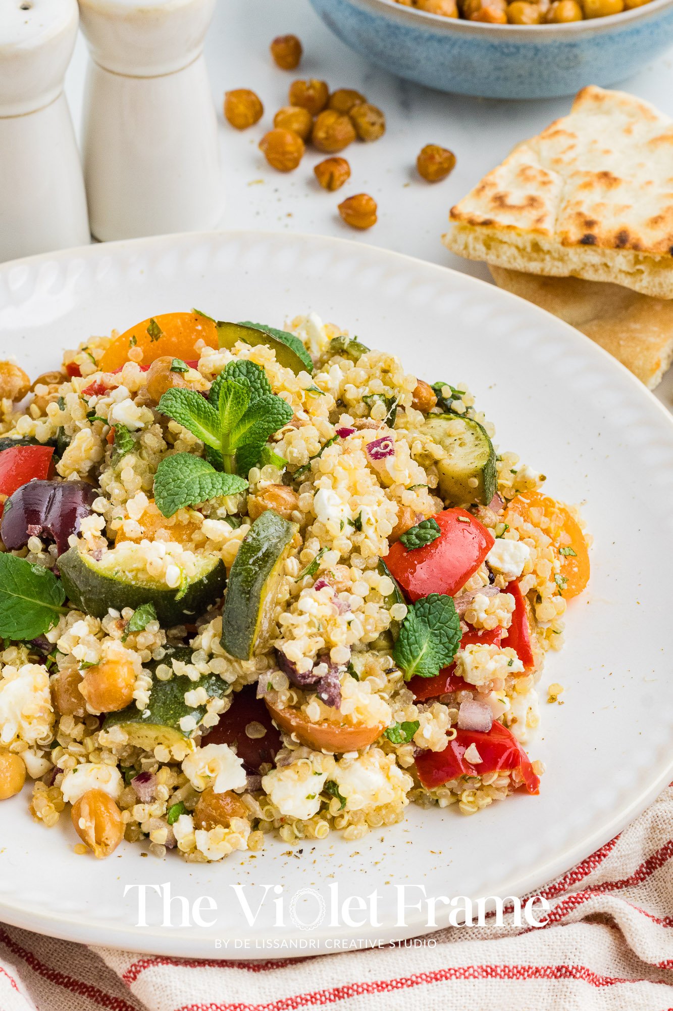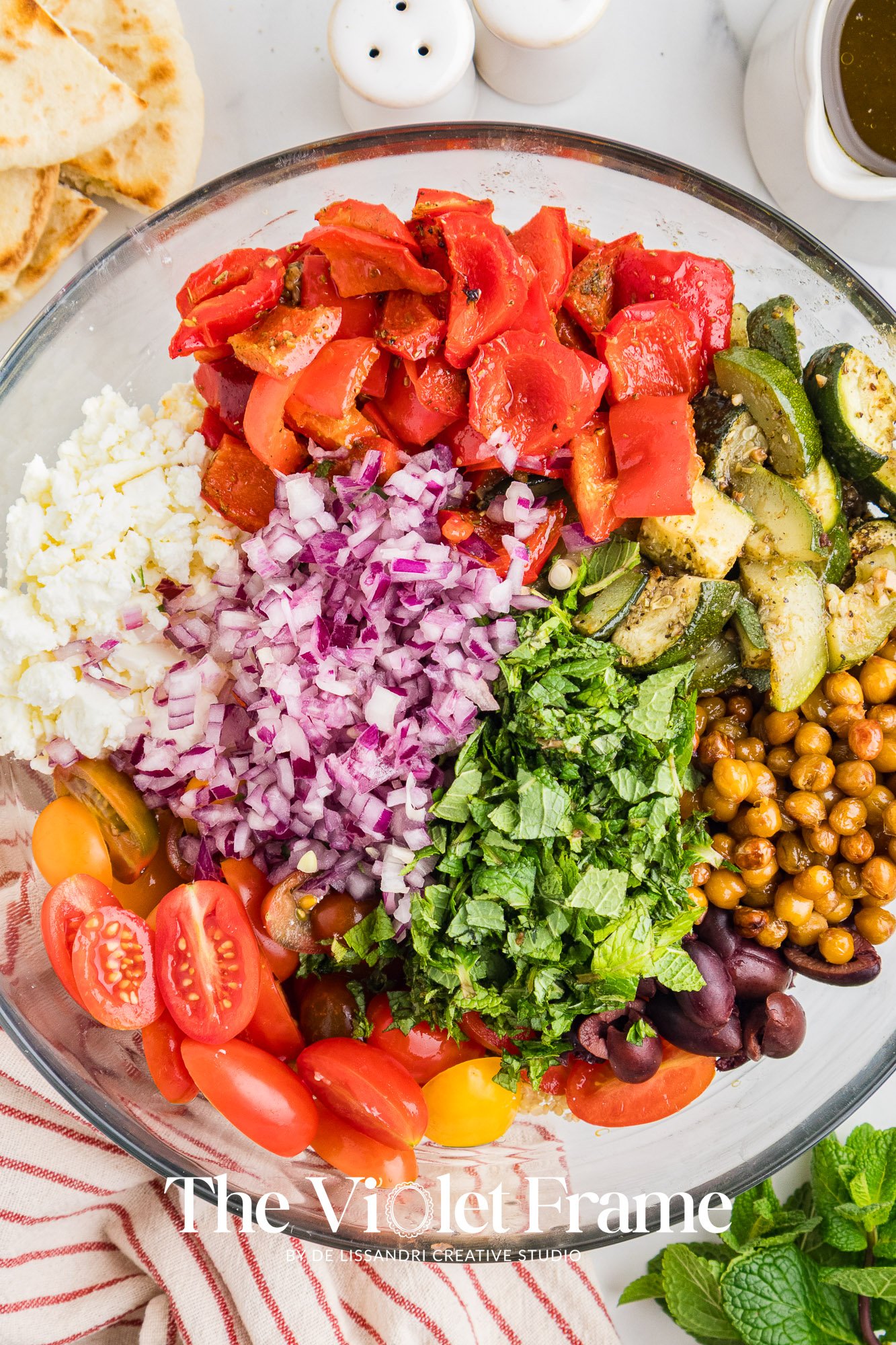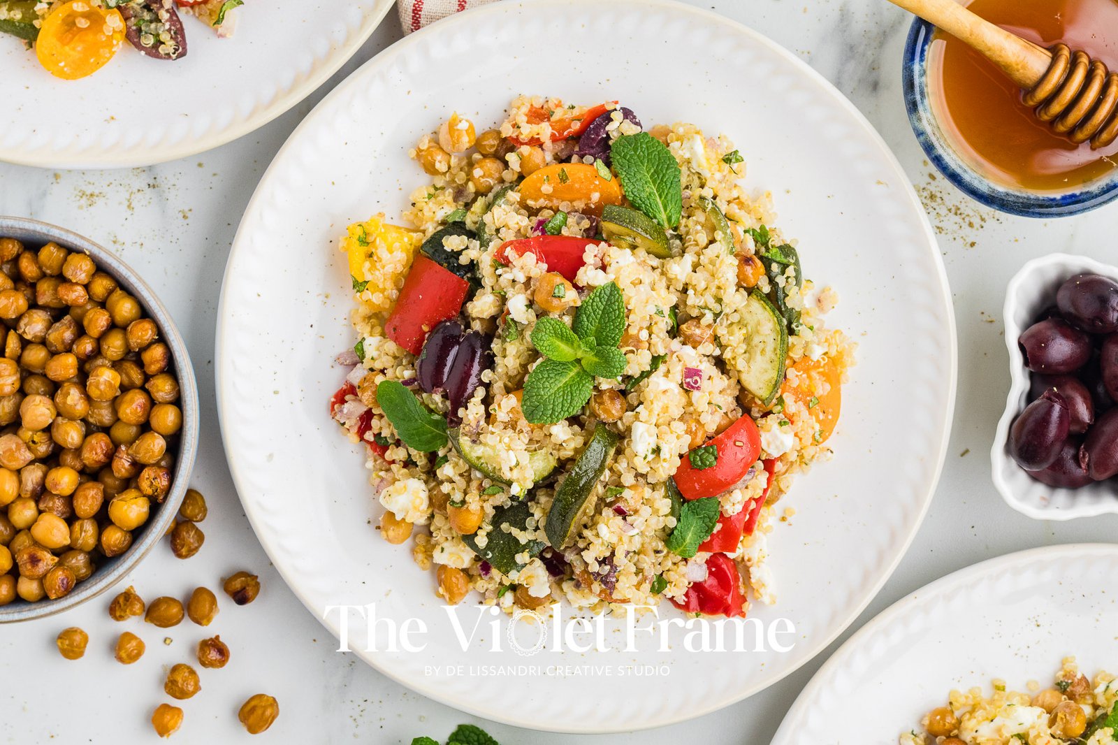 Featured Ingredients: quinoa, red bell pepper, roasted chickpeas, zucchini, Greek herbs, red onion, cherry tomatoes, Kalamata olives, mint, feta cheese, lemon juice, honey, balsamic vinegar.