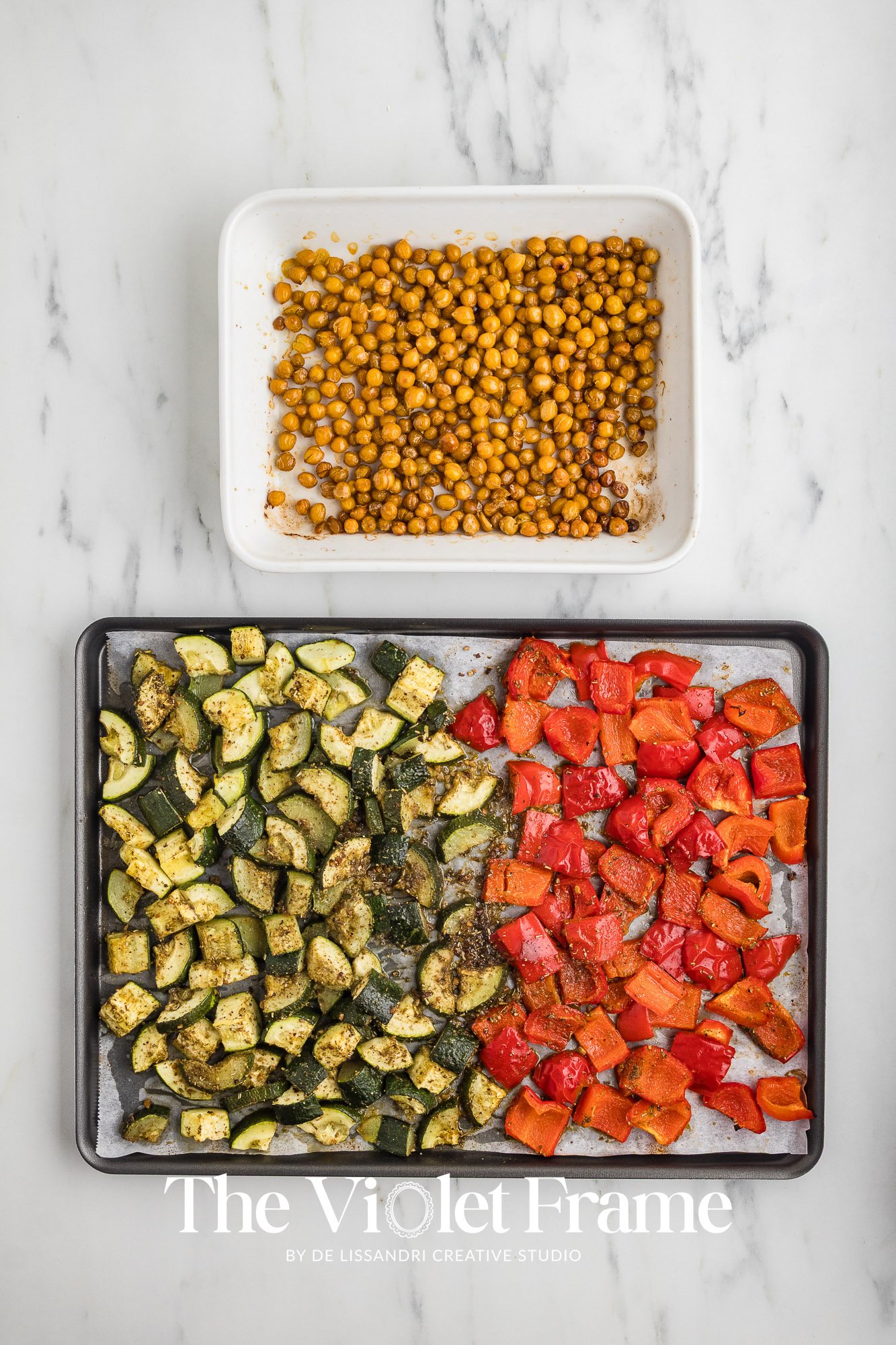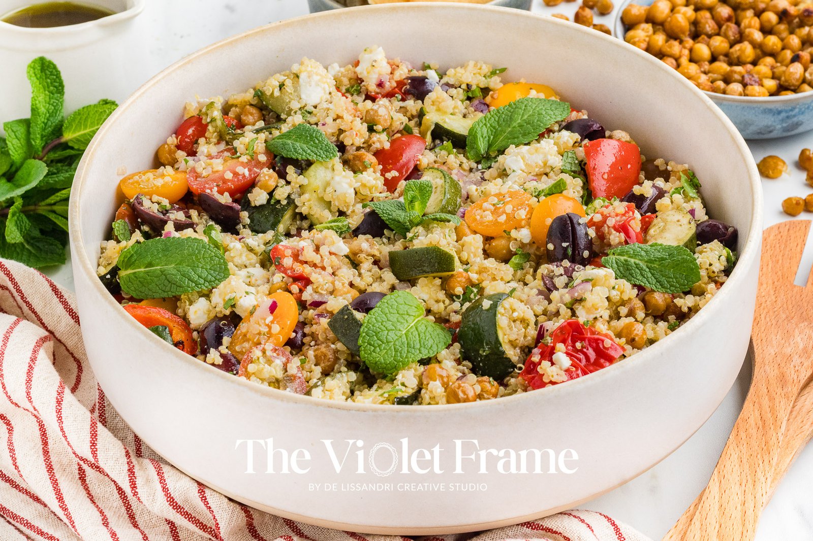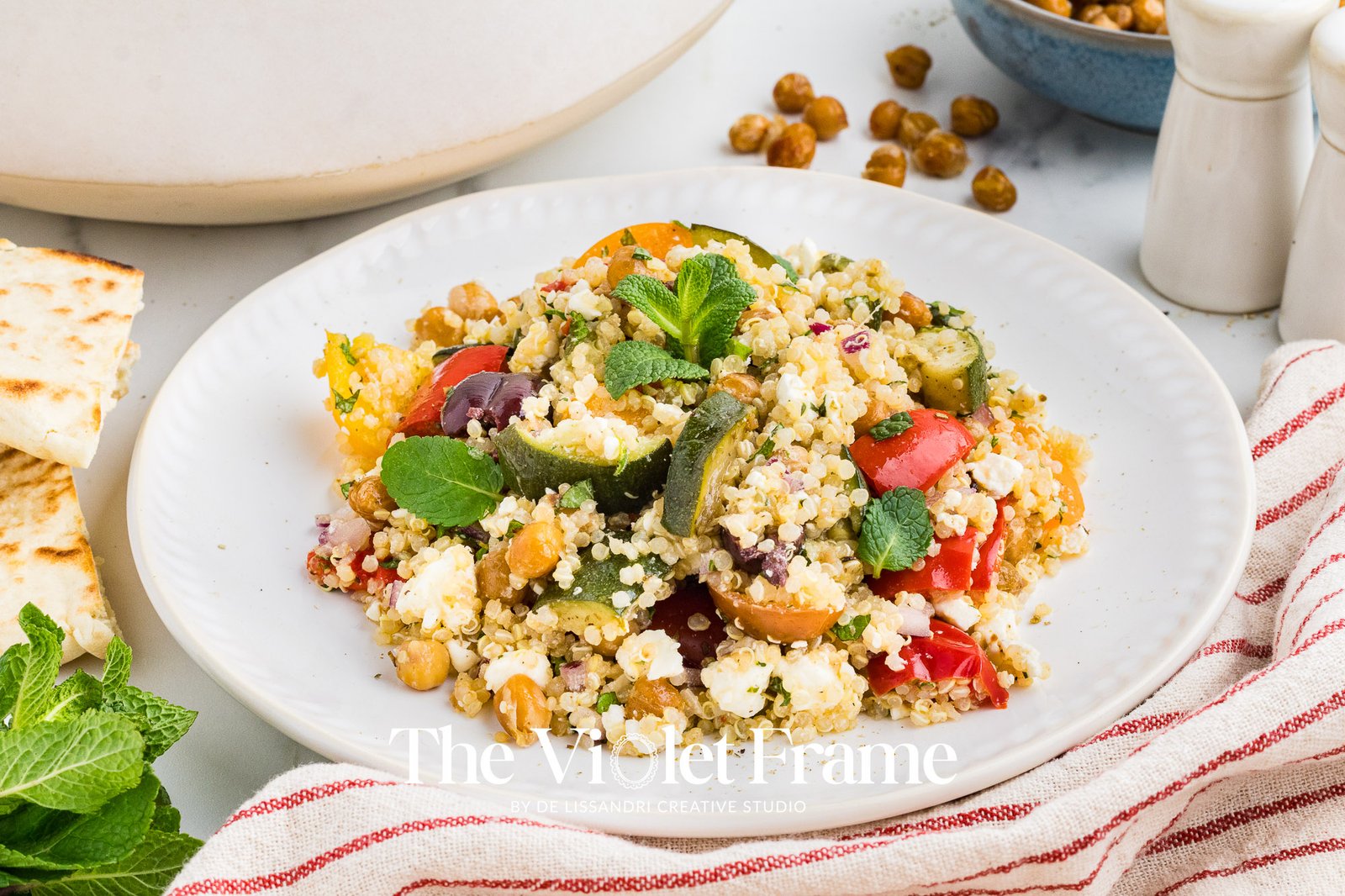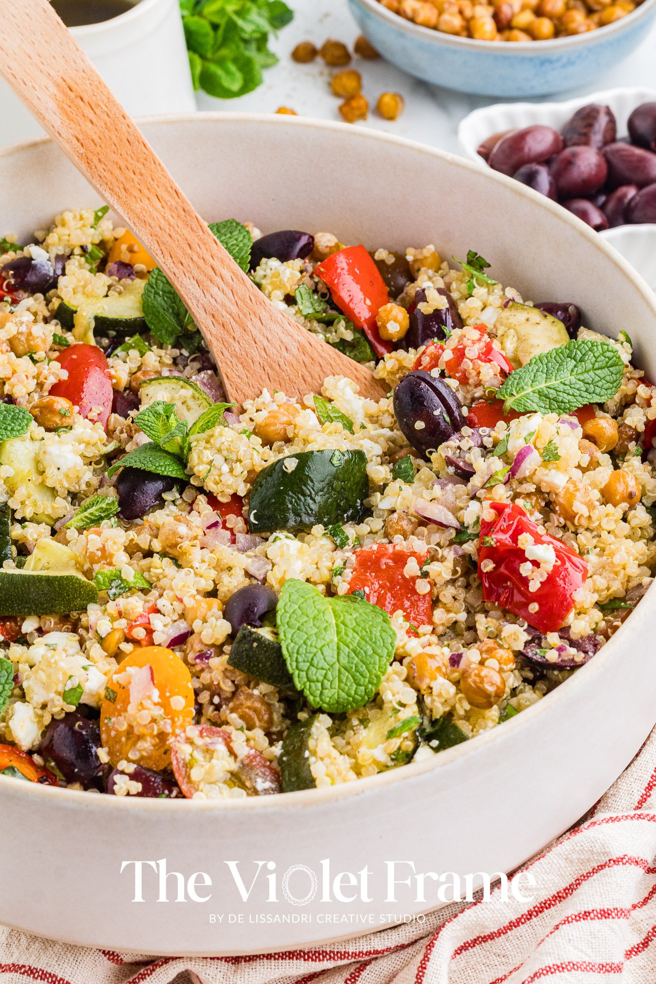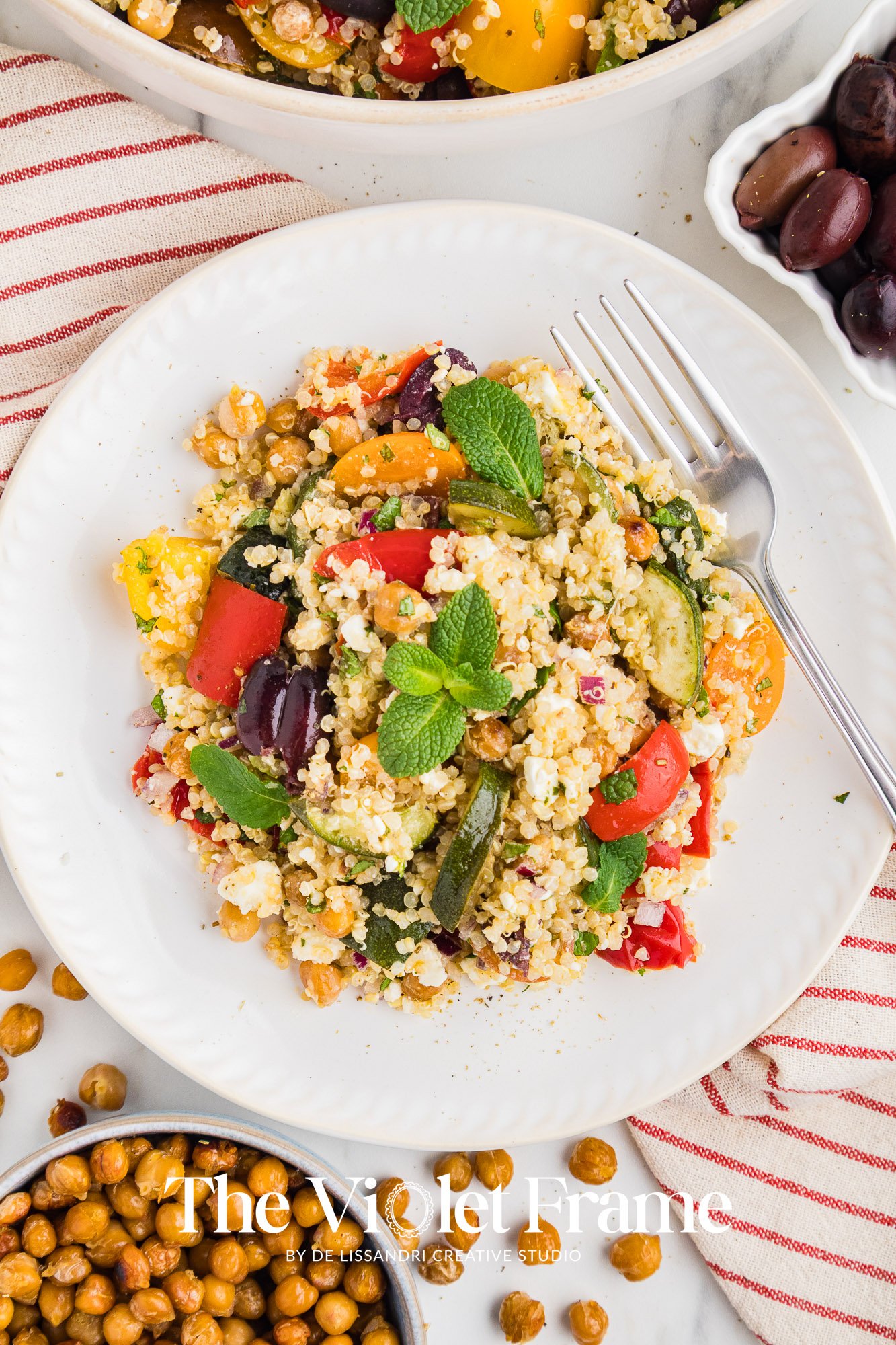 Featured Ingredients: quinoa, red bell pepper, roasted chickpeas, zucchini, Greek herbs, red onion, cherry tomatoes, Kalamata olives, mint, feta cheese, lemon juice, honey, balsamic vinegar.